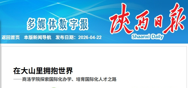 4月22日,《陕西日报》“教育”版面以《在大山里拥抱世界——商洛学院探索国际化办学、培育国际化人才之路》为题,专题介绍了我校近年来在国际化办学方面的积极探索与显著成效。报道指出,商洛学院通过中外合作办学、国际课程创新、师资国际化培训及多元文化交流等举措,走出一条独具特色的开放办学之路,让更多学子在“家门口”共享国际优质教育资源。商洛学院通过“师资走出去、理念带回来”,近三年累计选派140余名教师赴境...
