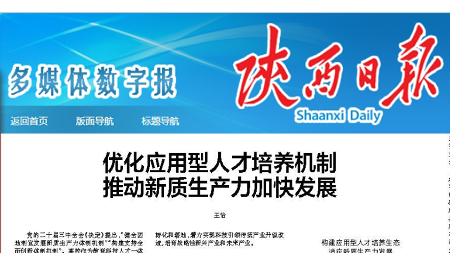 12月25日,《陕西日报》“理论”版面刊发了我校王怡教授以《优化应用型人才培养机制 推动新质生产力加快发展》为题的署名文章,文章结合我校办学实际和校地协同发展经验,深入剖析了高校在教育科技人才一体化发展背景下,如何培养高素质应用型人才,为新质生产力加快发展贡献更多力量。文章指出,应用型高校要主动作为,锚定进一步全面深化改革总目标,明确应用型人才培养定位,构建应用型人才培养体系,进一步完善人才培养机制...