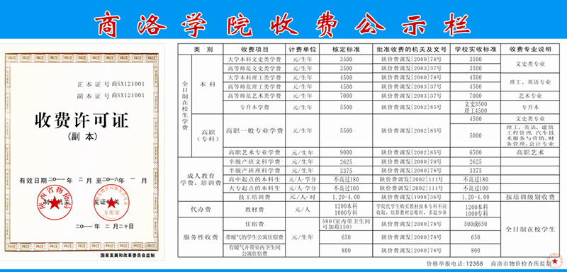我校执行商洛市物价局核定的收费项目和收费标准