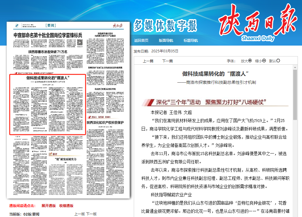 日前,《陕西日报》2版要闻栏目,以《做科技成果转化的“摆渡人”》为题,专题报道介绍了商洛学院科研工作者把论文“写”在商洛市“一都四区”建设产业链上的做法和经验。