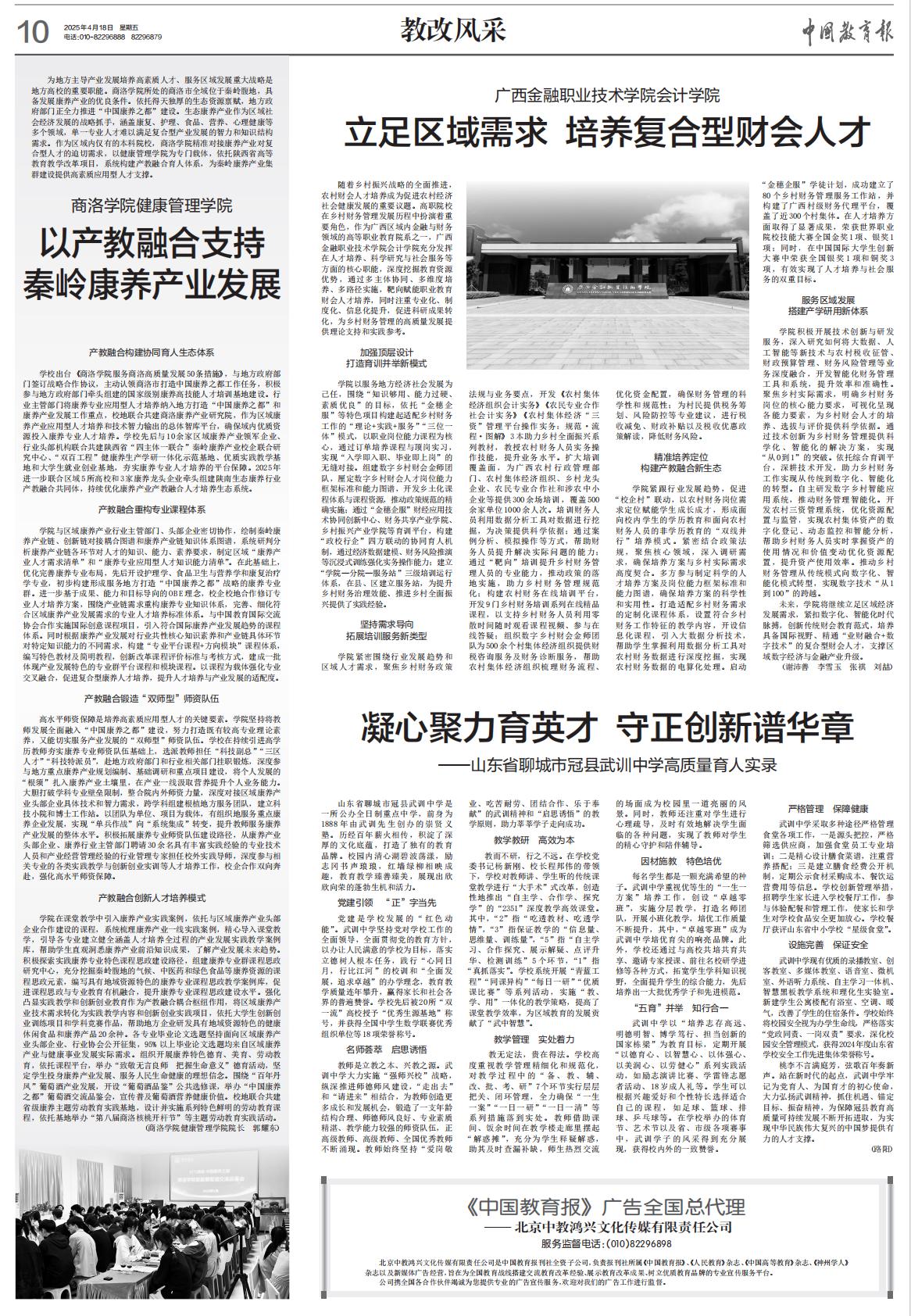 4月18日,《中国教育报》“教改风采”版面刊发专题报道《商洛学院健康管理学院以产教融合支持秦岭康养产业发展》。文章从构建协同育人生态体系、重构专业课程体系、锻造“双师型”师资队伍、创新人才培养模式四个方面全面介绍了我校深化产教融合、助力人才培养,积极协助地方政府打造“中国康养之都”的特色创新举措。