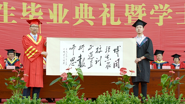 为了感谢母校的培育之恩,2017届毕业生向我校赠送书法作品“博闻强志承校训,正道直行报师恩”作为永久的纪念。党委书记龙治刚代表学校接受作品。