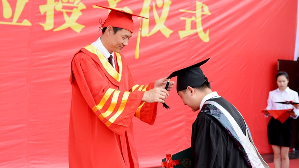 在学士学位授予仪式上,毕业生们依次走上主席台,校长范新会、党委副书记彭虎军、副校长刘勇分别为获得学士学位的毕业生正冠拨苏、颁发学位证书,并与他们一一合影留念。
