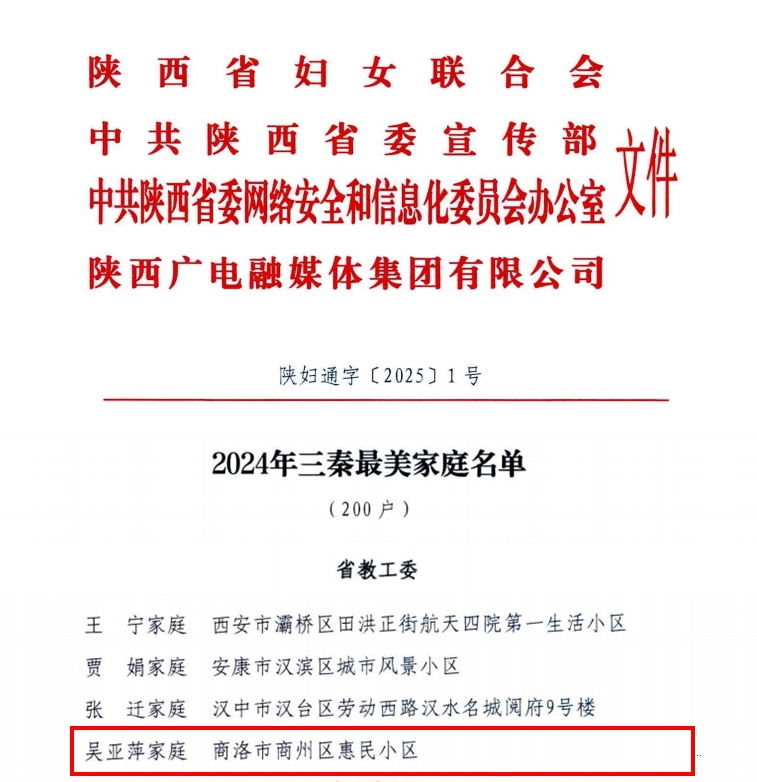 日前,陕西省妇联揭晓了2024年“三秦最美家庭”寻找推荐结果,我校吴亚萍家庭入选上榜,获得“2024三秦最美家庭”称号。