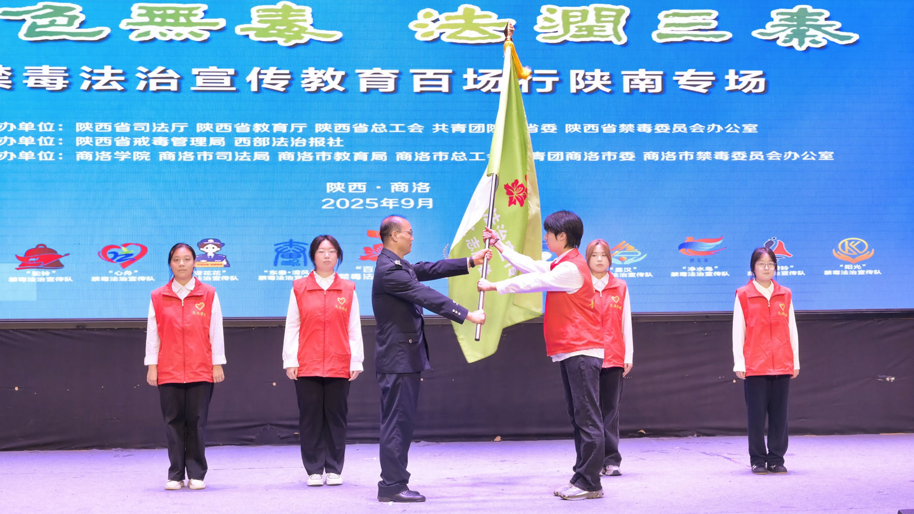 省戒毒管理局教育矫治处处长曹生明为我校志愿者团队授“百合花禁毒法治宣传团商洛学院志愿者”旗帜并赠送禁毒宣传资料。百合花禁毒法治宣传团干警代表陈俞戈及我校禁毒宣传学生志愿者代表分别作表态发言。