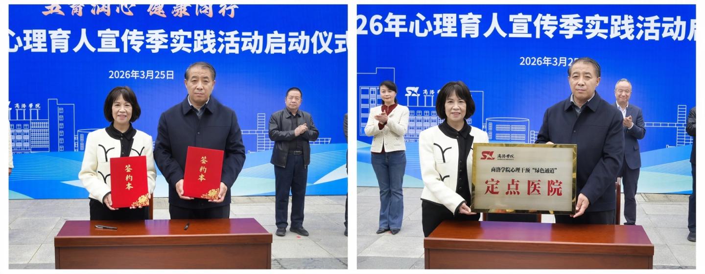 在参会领导与师生的共同见证下,王新军与陈建玲代表双方签订《商洛学院与商洛市中心医院合作协议》并现场授牌,标志着商洛市中心医院正式成为“商洛学院心理干预‘绿色通道’定点医院”