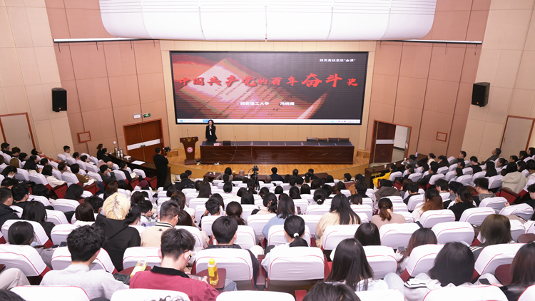 为深入学习贯彻习近平总书记关于学校思政课建设的重要讲话和重要指示精神,全面落实立德树人根本任务,3月27日,陕西高校思政“金课”巡讲报告会在商洛学院举行。陕西省高校思政“金课”巡讲团成员、西安理工大学副教授冯晓霞应邀到校,以《中国共产党的百年奋斗史》为题作专题报告。本次报告会采用线上线下同步形式开展,榆林学院、安康学院、榆林职业技术学院、安康职业技术学院、商洛职业技术学院师生代表,商洛学院党委宣传部、学工部、教务处、校团委、马克思主义学院主要负责人及全校思政课教师、学生代表共同聆听报告。