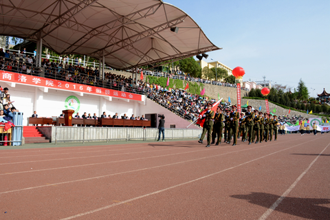 温暖的阳光照耀着欢腾的跑道,矫健的步伐谱写着青春的诗篇。4月21日,我校2016年田径运动会正式开幕。校领导刘建林、范新会、魏书堂、彭虎军、刘宝盈出席开幕式。各二级学院和教职工代表队组成10个方队,以昂扬的姿态通过主席台,展示了我校师生积极向上、朝气蓬勃的风采。党委书记、校长刘建林宣布运动会开幕。党委副书记、副校长、体育运动委员会主任范新会致开幕词,党委副书记彭虎军主持开幕式。