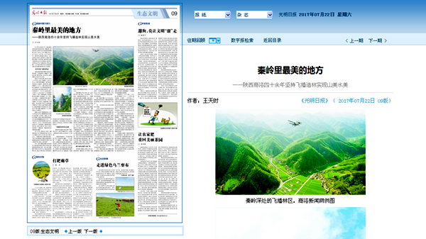 7月22日,我校教师王天时教授在《光明日报》以《秦岭里最美的地方——陕西商洛四十余年坚持飞播造林实现山美水美》为题发表文章,详细介绍了商洛飞播造林带来的生态美,总结了商洛绿色发展的经验。全文如下: