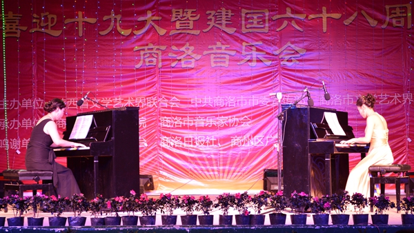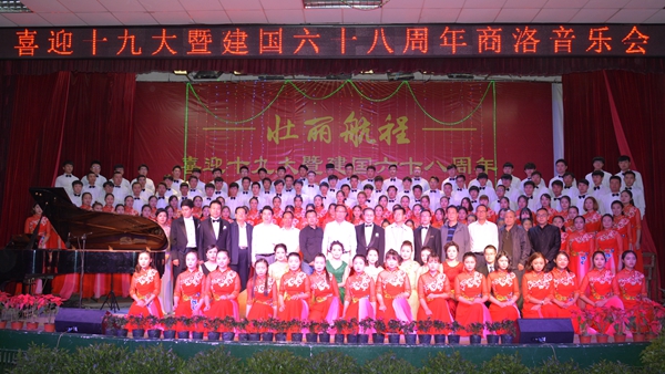 9月28日晚,由陕西省文学艺术界联合会、中共商洛市委宣传部、商洛市文学艺术界联合会主办,我校艺术学院、商洛市音乐家协会承办的,以“壮丽航程”为主题的喜迎十九大暨建国68周年商洛音乐会在我校大学生活动中心上演。校领导龙治刚、王思怀、魏书堂、刘宝盈,省文联组联部副主任赵光远、赵长川,商洛市政协副秘书长杨平安、郭毅,商洛市委宣传部副部长、市文明办主任李丹峰,商洛市人大常委会教科文卫工委主任郭菊贤,商洛日报社副总编辑赵有良,商洛市文广新局副局长王劲,市文联党组书记王良、专职副主席李志华,商洛市音乐家协会主席林宏彦、市青年作协主席冯玲子同商洛市音乐届人士、我校处级领导干部、师生代表一同观看了晚会。