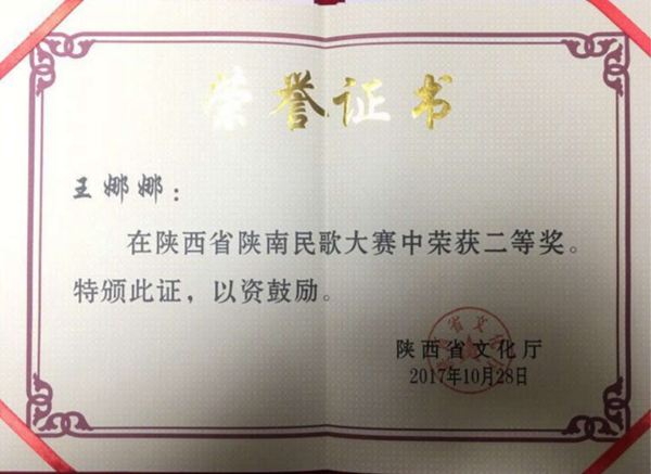 10月29日晚,由省文化厅、汉中、安康、商洛市共同主办的陕南民歌大赛在西安举行颁奖晚会,省文化厅党组书记明平英、商洛市委常委、副市长武文罡,汉中市副市长何俊杰及汉中、安康和商洛3市文化部门负责人出席,并为获奖歌手颁奖。我校艺术学院教师王娜娜获得陕南民歌大赛二等奖。