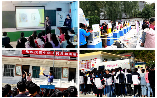 为扎实践行2019年全国科普日“礼赞共和国、智慧新生活”活动主题,进一步推进“双百工程”结对帮扶丹凤县工作,我校师生继9月11日在蔡川镇九年制学校成功开展科普公益活动后,9月26日,又将“科普大篷车”开进丹凤县红色革命热土——庾岭镇,为庾岭中学300余名师生带去了一场精彩的“乡村流动科技馆”校园展演。