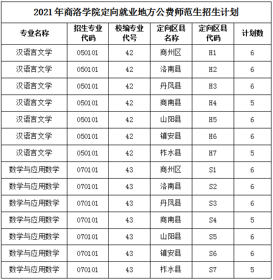 2021年我校招收定向就业地方公费师范生的专业有汉语言文学和数学与应用数学,招生计划各40名,分别以定向就业商洛市各区、县设置招生代码,招生批次为提前批本科。