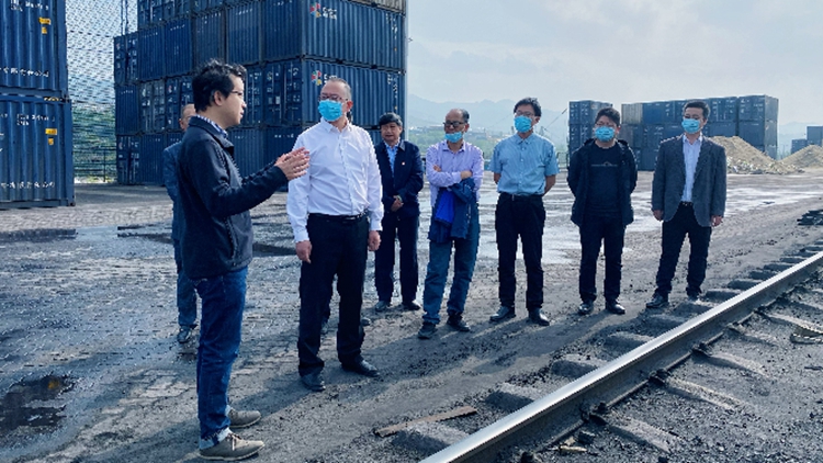 郭瑾一行在商洛陆港实业集团有限公司总经理谭震、集团党支部书记李开旺、副总经理张同谦等人陪同下参观了公司货场,观看了公司形象宣传片。