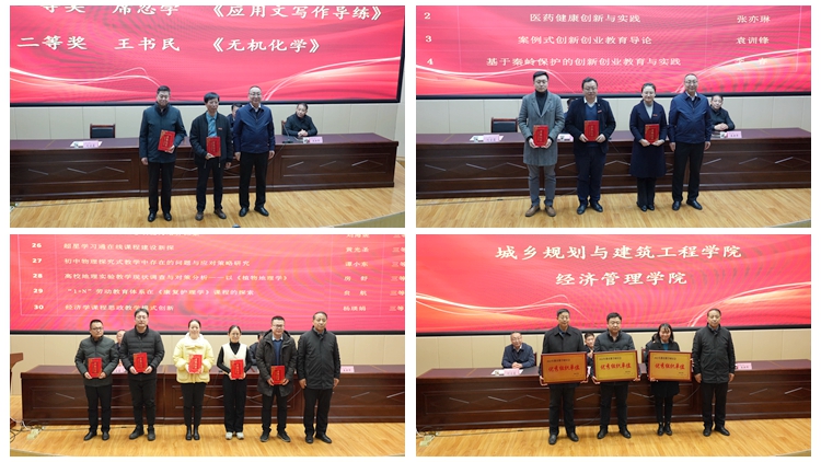 大会表彰了我校2023年教育教学研讨会优秀论文、优秀组织单位、陕西省高等教育优秀教材奖、陕西高校创新创业课程、第二批陕西省课程思政示范课程、陕西本科教育教学改革研究项目、第五届陕西本科高校教师教学创新大赛、陕西高校思政课程课程思政“大练兵”省级展示活动获奖教师。
