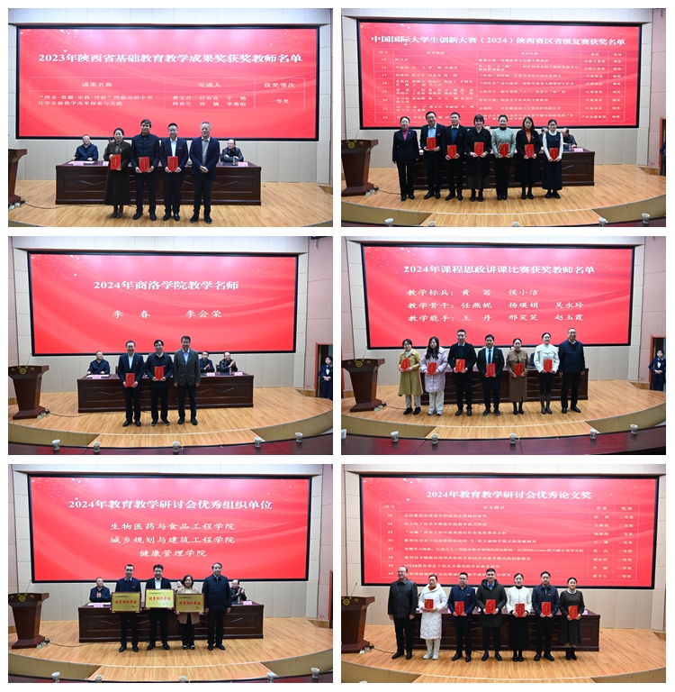 大会表彰了我校2023年陕西省基础教育教学成果奖获奖教师、中国国际大学生创新大赛(2024)陕西赛区省级复赛获奖项目、2024年商洛学院教学名师、2024年课程思政讲课比赛获奖教师、2024年教育教学研讨会优秀组织单位、2024年教育教学研讨会优秀论文奖获奖教师。