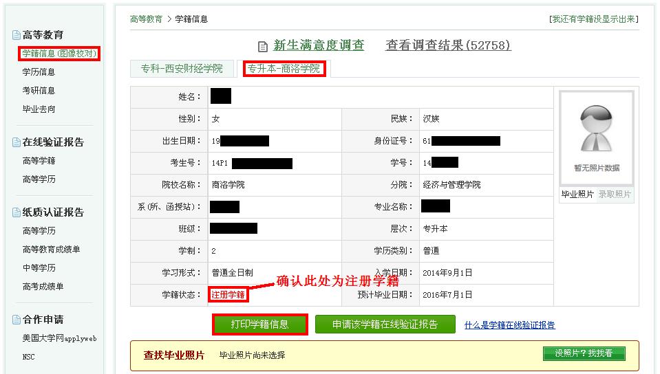 3.学籍信息来自高考及专升本招考时的原始数据(以录检表为准),如果信息有误,请及时联系教务处;如果属于招考后信息变更,除2013级专升本毕业班外,本次查询暂不予修改;