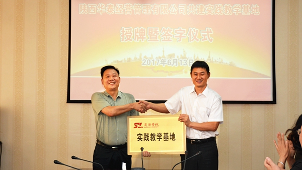 6月13日,我校与陕西华泰经营管理有限公司共建实践教学基地授牌暨签字仪式在学校四楼会议室举行。副校长刘勇向陕西华泰经营管理有限公司董事长李仁斌授牌。教务处处长李超与陕西华泰经营管理有限公司总经理闫博签订合作协议。仪式由经管学院副院长王怡主持。经管学院、建工学院教师代表参加活动。