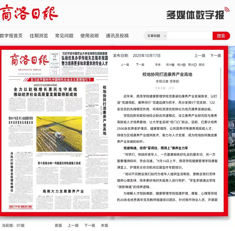 如今,从培育本土人才到攻坚产业难题,从深耕科研转化到服务基层民生,健康管理学院以“党建红”为引领,以“康养绿”为底色,在秦岭山间的养老院、企业车间、社区广场,都留下了校地协同推进康养事业的扎实足迹。