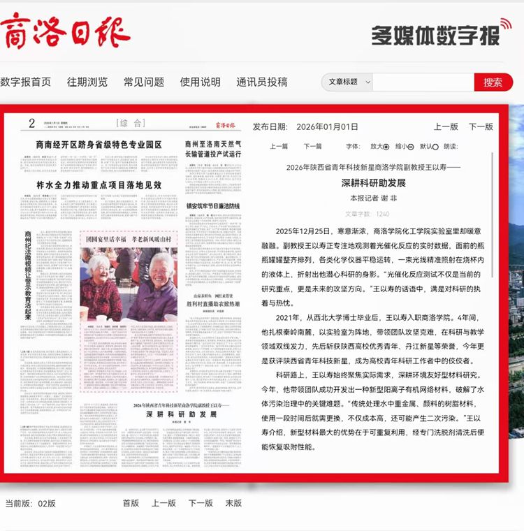 这一成果的背后,是无数个日夜的坚守与付出。为筛选出最优原料,团队连续一年开展试验,逐一验证五六十种材料的性能;洗脱剂的配比更是历经上百次调试,才找到最佳方案。“传统树脂材料吸附需24小时,我们的新材料仅用30秒就能完成吸附过程。”谈及这项突破,王以寿难掩欣慰。快速吸附、可循环利用的特性,让该材料在水体污染治理领域具有广阔的应用前景,目前已与商南一家企业开展商业化洽谈,有望尽快转化为实用成果。