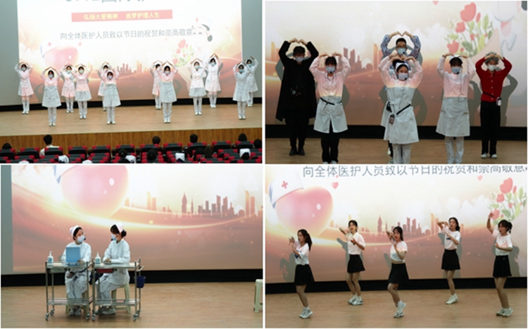 护理系师生历经3次彩排,一起自编、自导、自演9项节目,以此迎接国际护士节的到来,致敬我们的“白衣天使”:“护士礼仪展示”对护士职业礼仪进行了完美的诠释;情景剧“白衣赞”贴近生活、富有创意,体现了护士们甘于奉献、大爱无疆的精神追求;舞蹈“你最最最重要”展示了学生们扑面而来的青春活力;“呼吸操”带来增强肺功能的锻炼方法;手语操“国家”用双手传递出温暖;大合唱“追梦赤子心”用响亮的声音告诉世界没有什么能够阻挡一颗赤子之心;舞蹈“抗疫天使”,让我们懂得生命可贵以及护士的艰辛和伟大;洗手舞“天天向上”突出了正确洗手是自身防疫的关键;最后,朗诵“白衣天使”将整个现场气氛推向了高潮,为大家提供了一场视觉盛宴。