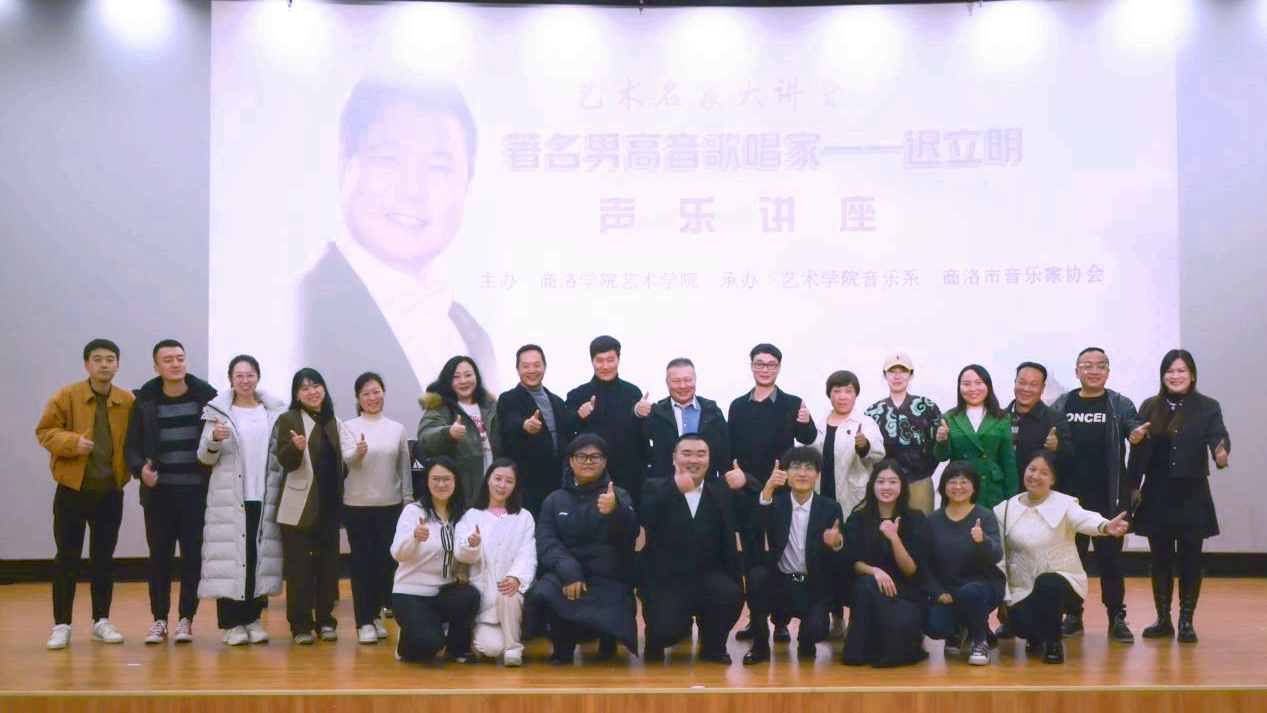 11月21日,艺术学院“艺术名家大讲堂”首期开讲,邀请著名男高音歌唱家、国家一级演员、歌剧表演艺术家迟立明为艺术学院师生作了两场声乐讲座。副校长刘宝盈出席活动并为迟立明颁发我校兼职教授聘书。艺术学院院长李世鹏,副院长刘志华,音乐系全体师生,商洛市音协人员以及部分校外音乐工作者观摩了讲座。