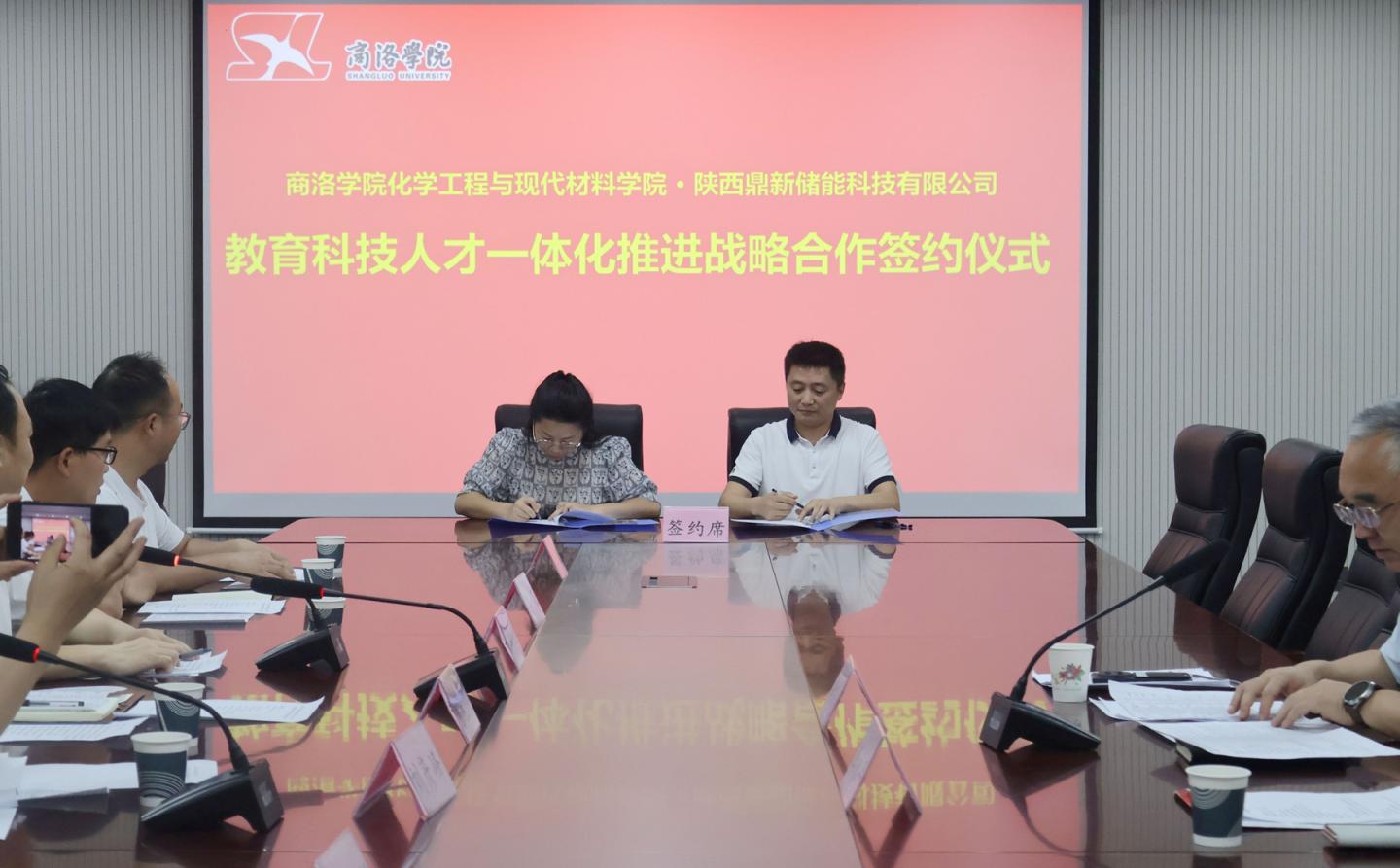 为深化产教融合、推进人才订单式培养,6月24日,化材学院与陕西鼎新储能科技有限公司签署《教育科技人才一体化推进战略合作框架协议》。签约仪式上同时举行了由鼎新公司赞助的“鼎新杯”商洛学院第三届节能减排社会实践与科技竞赛颁奖仪式。