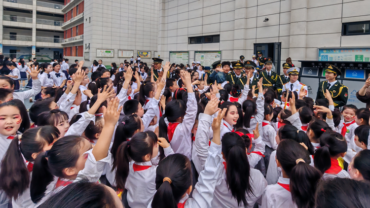 当日上午,在附属小学操场举行的运动会开幕式上,国旗护卫队队员身着礼宾服,肩扛五星红旗,步调铿锵有力,从操场一侧庄严护送国旗入场。随着指挥员口令下达,现场奏响《义勇军进行曲》,五星红旗冉冉升起,全场师生行注目礼。升旗仪式结束后,国旗护卫队队员与部分小学生进行了现场互动,队员就礼宾服配饰、队列口令等内容解答学生提问,并指导少先队礼的规范动作。