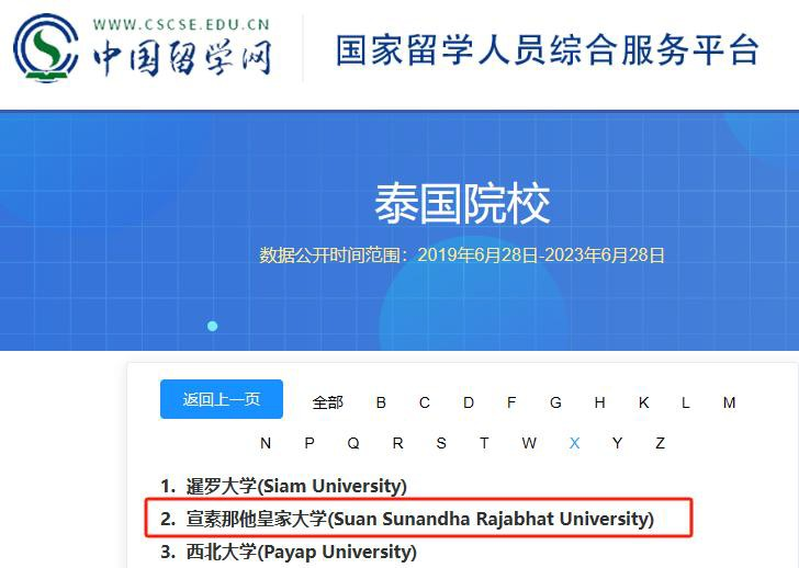 宣素那他皇家大学(Suan Sunandha Rajabhat University)是中国教育部认证、首批推荐泰国重点高校、中国教育部涉外监管信息网推荐留学院校。大学设有14个院系以及附属小学与中学,本科、硕士、博士专业学位学科120余个,现有全日制在校生29000余名。宣大连续20年在泰国皇家大学中综合排名第1位;是教育部留学服务中心战略合作伙伴,长期与国内外多所国际知名院校长期进行学术合作与交流,出席中国-东盟及“一带一路”教育展、中国国际巡回教育展等。